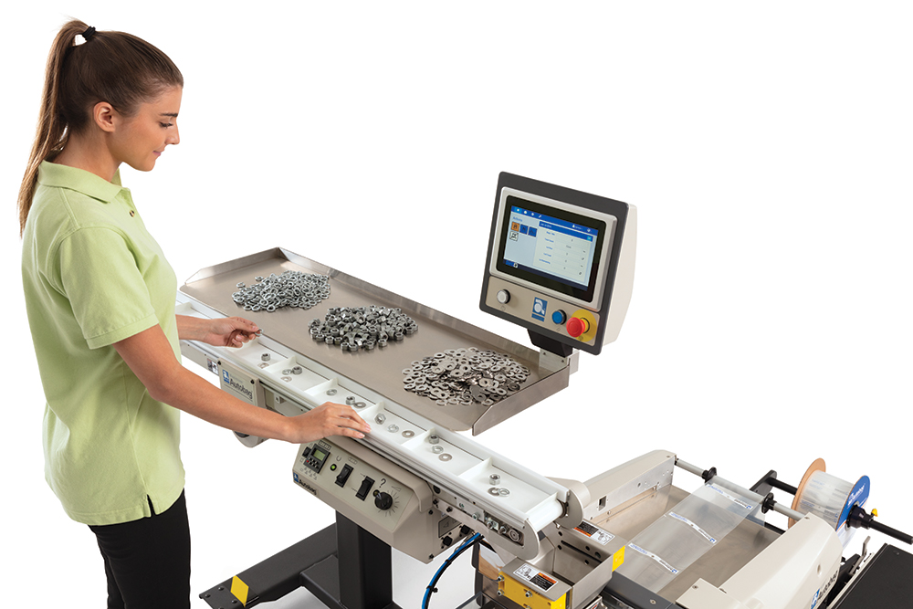 When used in conjunction with the Autobag 500 bagging system, an operator retrieves products from the load tray and places them into the Maximizer conveyor flights. The conveyor then delivers the product to the detection eye and accumulating funnel. Once the pre-set count is reached, the product is dropped into a pre-opened bag, sealed and detached, while another bag is presented for loading. This continuous conveying and counting motion speeds productivity in most hand-load applications.